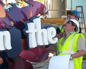 With so many construction trades onsite trying to complete their portion of the remodel work, it was a collaborative effort to install the signage at the right time. The weekly construction meetings were vital to understand the best time to get the crane trucks onsite to attach the completed signage to the building. The project management team worked with the structural engineer, electrician, concrete and other subcontractors to make sure utilities and other requirements were completed prior to installation. Due to the size of some of the signage, the installation was performed in phases because they signs were made in pieces and assembled onsite. Once installation was complete the architects would walk through the park to ensure the signs achieved the playful look. Any changes that the architects wanted to make were made in the field.